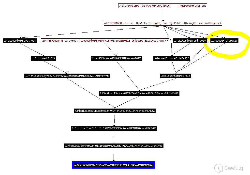 對于符號路徑的執行我們提供了一張流程圖,正如所示,有幾條路徑都可以執行到ResTICon,通過一些試驗,我們選擇使用由vbscript.dll中調用的導入函數OLEAUT32!_OleLoadPicture(圖中黃圈所示),通過這個函數再執行到ResTICon函數位置。