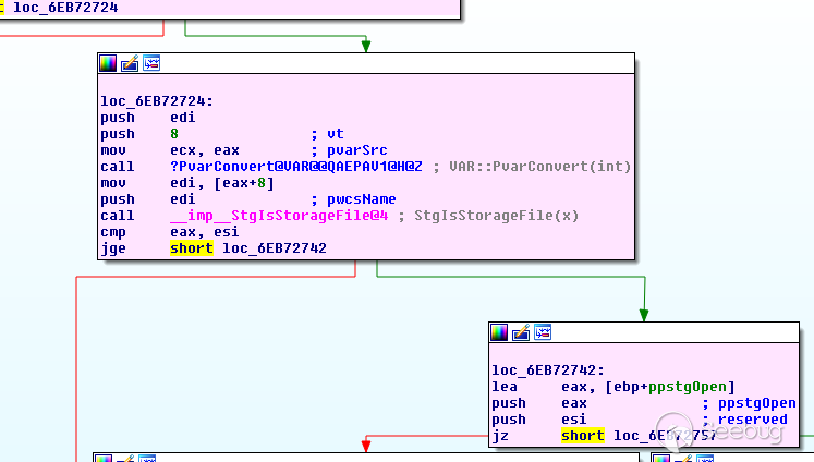 通過分析,我們發現在調用VbsLoadPicture之后,執行過程中會先調用一個call impStgIsStorageFile,這個函數也是OLEAUT32.dll中的函數,正是ole32!StgIsStorageFile導致的無法執行到OleLoadPicture,那么這個函數的是什么呢?