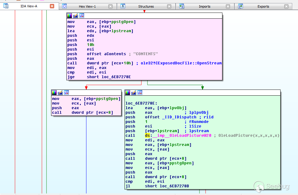 實際上我們執行的過程執行了粉色塊的部分,而OleLoadPicture調用則在右邊,可以看到在之前會調用ole32!CExposeDocFile::OpenStream,這個過程會有一個對流名稱“CONTENTS”的檢查,如果正確則會進入右邊分支(我們想要的)處理,因此,我們需要在OpenMCDF中修改流的名稱,改為CONTENTS。