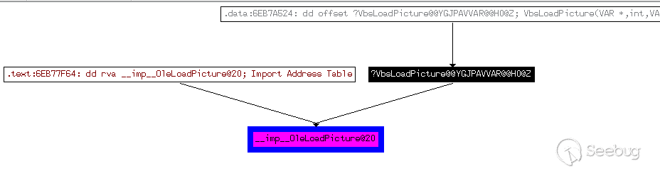 可以看到,在vbscript.dll中經過幾次調用,會執行到_imp_OleLoadPicture位置,這個imp實際就是在vbscript.dll中執行到該位置時會調用OLEAUT32.dll中的OleLoadPicture函數,這樣就和之前我們分析的幾種分支中我們選用的部分重合了。