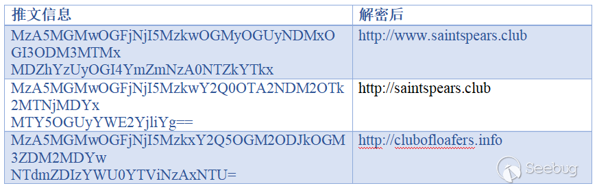 我們通過base64解碼這些推文后,仍然看不到任何有意義的數據。因此,我們通過該Twitter鏈接“https://twitter.com/sHybzhzZWJgdbdj”來做關聯分析,并且發現了一些可疑的apk文件,通過分析確認該apk文件為Android平臺下一款危害性極大的惡意APP,并且目前還處于活躍狀態。通過深入分析我們發現,該惡意APP會連接該Twitter鏈接“https://twitter.com/sHybzhzZWJgdbdj”獲取推文,并將其解密成為C&C地址,其解密算法模擬了base64的效果,但并非為base64算法,以此迷惑發現異常推文的分析人員。解密后的字符串如表1所示: