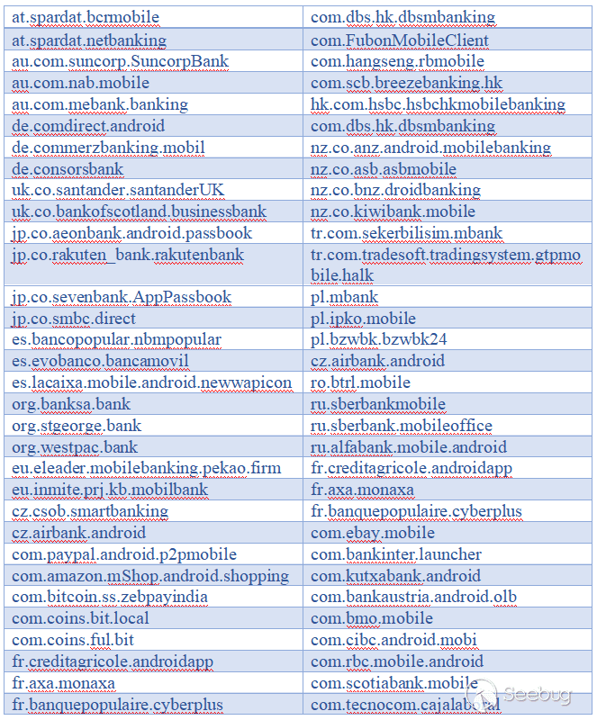攻擊者的劫持目標幾乎涵蓋全世界各大金融機構的手機APP,總數達到了300多個,涉及中國、美國、英國、日本、中國香港、法國等40多個國家和地區,部分目標金融APP的包名見表3: