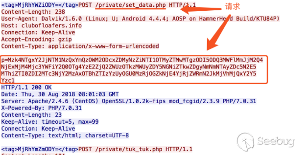 圖5是我們抓取到的該惡意代碼變種和C&C服務器通信的數據包,從圖中可以看出,該變種使用http協議和C&C服務器進行通信,通信數據被加密處理后進行傳輸。我們利用分析出的解密算法對圖中加密數據進行解密,分別得到“aa5193bdfeb39625:(CHINA MOBILE):4.4.4:cn::AOSP on HammerHead (aosp_hammerhead):V::0:0:”和“|OK|”,很顯然是一個木馬上線包。