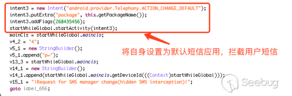 惡意代碼將自身設置成默認短信應用,攔截用戶短信: