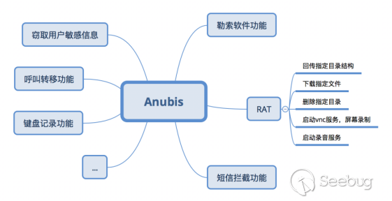 2018年3月5日,PhishLabs發現了銀行木馬BankBot的一個新變種,并第一次將其命名為Anubis,Anubis同樣基于BankBot源碼開發,并整合了眾多不同類型惡意軟件的功能于一身。