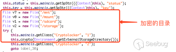 不同于常見的只是簡單禁止受害者訪問手機界面的鎖定屏幕的勒索軟件,Anubis對受害用戶的文件進行了加密,加密的目錄包括“/mnt”、“/mount”、“/sdcard”、“/storage”以及用戶的內在存儲卡目錄,見圖9。