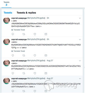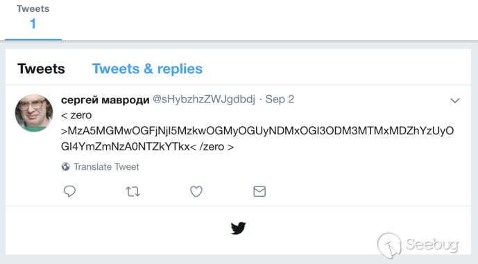 2018年8月底,啟明星辰ADLab監測到一個當月新注冊的異常Twitter賬戶,該賬戶在Twitter上發布了一些類似用base64編碼的推文。其2018年8月27日發布了兩條似乎完全相同的推文,并且在我們發現當天,又連續發布兩條不同的推文(見圖1)。