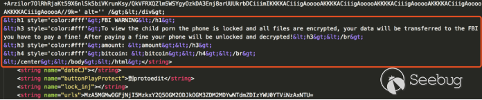 鎖定頁面htmllocker是從遠程服務器動態獲取到的并保存在其配置文件set.xml中,如圖12,我們可以看到FBI WARNING的勒索信息:告知受害用戶的手機被鎖定,并且所有的文件被加密,用戶的數據將會被傳送到FBI,除非受害用戶支付罰金方可解密。