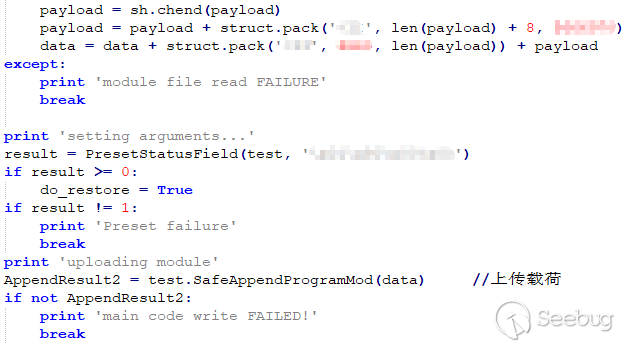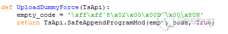 TsHi.py是框架的高級接口,允許讀寫函數和程序,以及檢索項目信息和與植入有效負載的交互(如下所述),其包括SafeAppendProgramMod函數,該函數可獲取程序表,讀取程序和函數,并將提供的shellcode附加到現有的控制程序,它還在必要時處理CRC32校驗和。