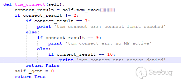 在tcm_connect函數中connect_result同樣為數據包類型標識碼,具體定義見上圖3-4,其中關鍵函數為tcm_exec(type參數的值為1)。
