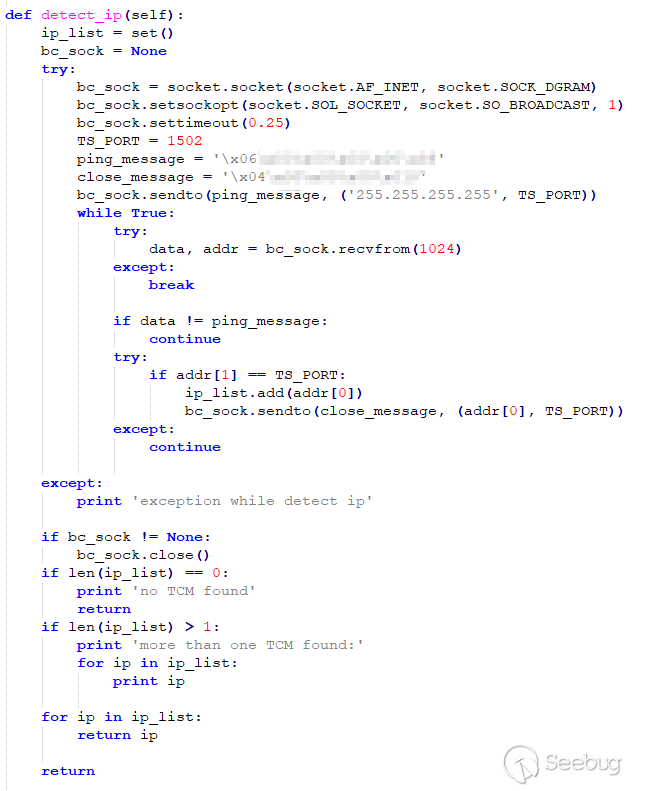TsLow.py可實現將上層制作的TriStation數據包通過UDP發送到Tricon通信模塊(TCM)的功能的最底層,還包括通過向1502端口發送UDP“ping”廣播消息來自動發現Tricon控制器。