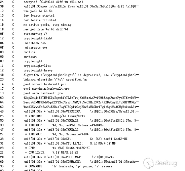 通過對挖礦樣本進行分析發現,子體是一個加殼后的標準礦機程序,子體加殼也是導致殺軟無法查殺的一個方式。子體加殼為 UPX 變形殼,可以抵抗通用脫殼機的脫殼。手動脫殼后發現為標準挖礦程序(開源礦機程序)。