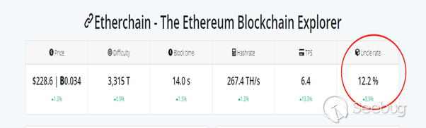 以太坊使用“幽靈協議(GHOST protocol)”來選擇區塊成為主鏈。分叉塊包括叔塊和孤塊。下圖中我們可以看到,當前以太坊叔塊的概率已經達到10%以上。所以直接簡單的將mental poker和安全多方計算的一些協議移植到智能合約平臺上時,發生不穩定事件的概率是不可忽略的。