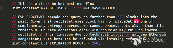 在這兩種攻擊場景下,莊家都能夠輕松控制交易結果。當然莊家并不會對每筆交易都發起這種攻擊,而是可以選擇用戶獲獎特別大的交易進行操控。Dice2win官方實際上已經在智能合約代碼得注釋中聲明了可能會發生“技術問題和以太坊擁堵”原因造成荷官無法開獎(大約1個小時內),則用戶可以提回下注款。