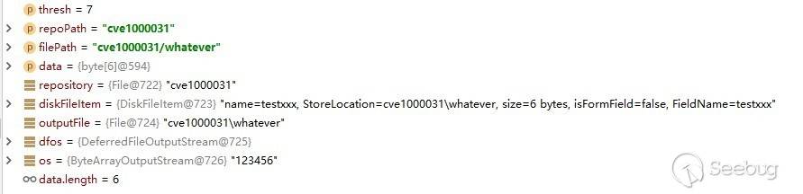 其中的tempDir就是我們設置的repository,即cve1000031。tmpFileName是由DiskFileItem是自動生成的。最終和tempDir組合得到的文件路徑就是cve1000031\upload_7b496a67_4fc4_4b14_a4e7_ff5aceb82aaf_00000000.tmp。
