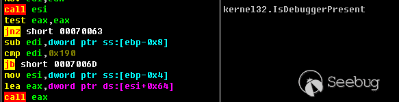 注入的ShellCode首先會通過IsDebuggerPresent檢測是否處于調試狀態: