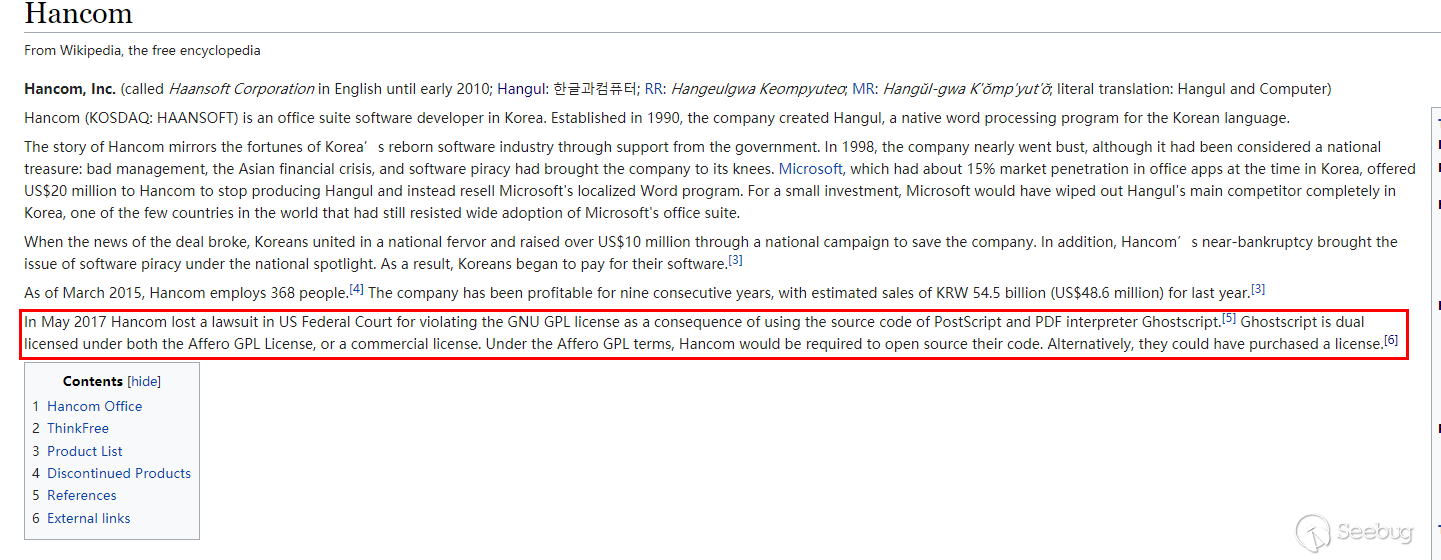截止目前,Hangul Office產品線已經有了很多版本分支,而至少在Hangul 2010就引入了GhostScript開源組件用于解析EPS文件。根據維基百科資料顯示:在2017年5月由于Hangul Office產品線使用了GhostScript組件而沒有開源,這一行為違反了GhostScript的開源協議GUN GPL,被要求開源其產品的源代碼。