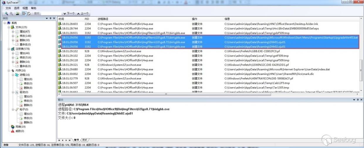 通過進程行為分析可以發現,這其實是Hancom Office自帶的gbb.exe程序執行了惡意文件的釋放操作: