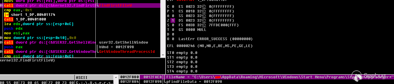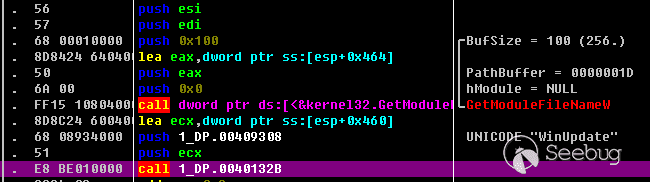 使用OD腳本脫殼后進行分析,樣本執行后首先檢測進程路徑是否包含”WinUpdate”(樣本本身包含的名字),若不是則退出: