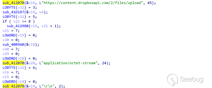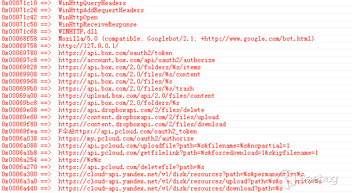 并通過網盤上傳數據,網盤的APIKey會內置在樣本數據里。下圖為提取到的字符串的信息,樣本會通過API調用4個國外主流的網盤包括:pcloud、box、dropbox、yandex