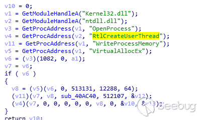 之后利用WriteProcessMemory,RtlCreateUserThread向sort.exe注入一段ShellCode執行: