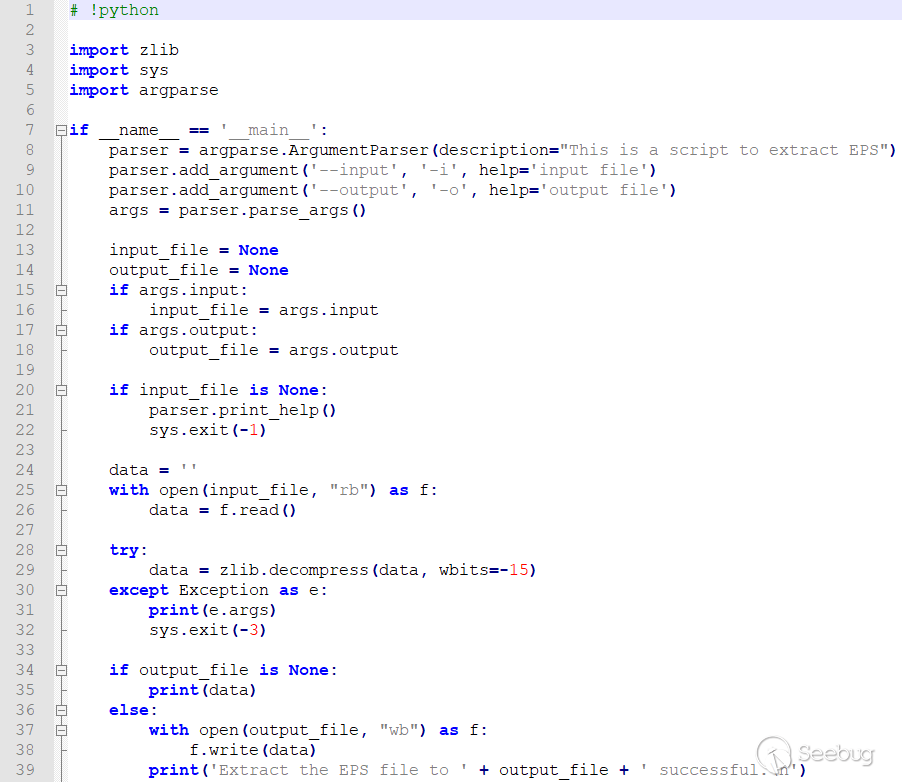 而HWP文件中的大部分流都是經過zlibraw deflate壓縮存儲的,EPS流也不例外。可以通過Python解壓縮惡意HWP文件中的EPS流,代碼如下:
