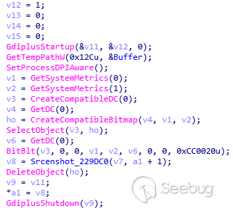 如果樣本未檢測到沙箱運行環境,則會執行后續的主要功能,包括獲取屏幕截圖: