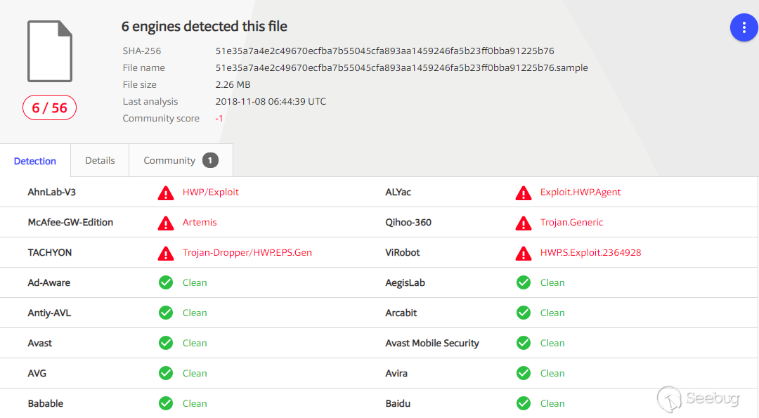 而截止我們發布本篇報告時,VirusTotal上針對該攻擊樣本的查殺效果如下,也僅僅只有5家殺軟能檢查出其具有惡意行為: