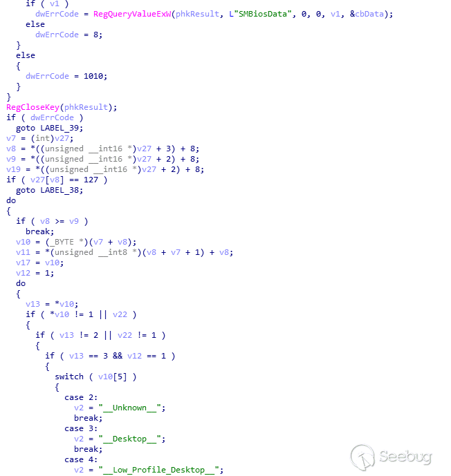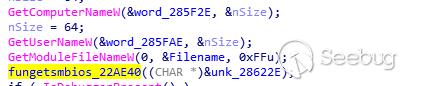 最終解密后的PE文件是ROKRAT家族的遠控木馬,該木馬會獲取計算機名稱、用戶名、并通過smbios判斷計算機類型: