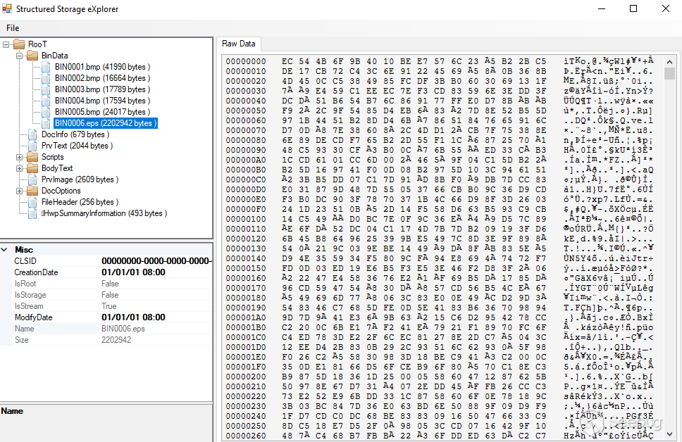 要分析HWP中的EPS腳本,需要將EPS腳本提取出來。而HWP文件本質上是OLE復合文件,EPS則作為復合文件流存儲在HWP文件中,可以用現有工具oletools、StructuredStorage eXplorer、Structured Storage Viewer等工具查看和提取,以下是StructuredStorage eXplorer工具查看的效果圖: