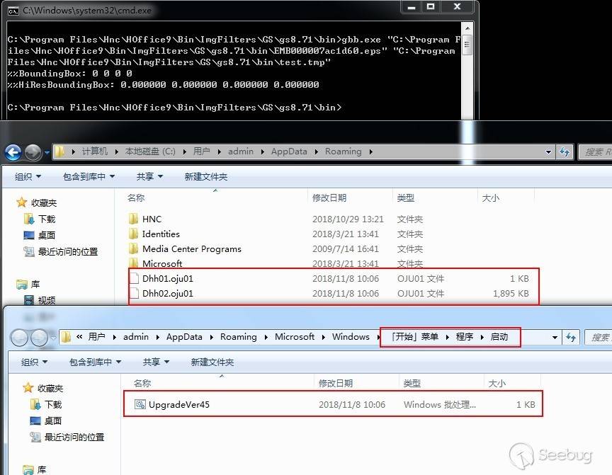 HWP樣本打開后不會彈出任何提示框,也不會有任何卡頓,便會靜默在當前用戶的啟動目錄釋放惡意腳本UpgradeVer45.bat,并且在%AppData%目錄下釋放Dhh01.oju01和Dhh02.oju01文件,如下圖: