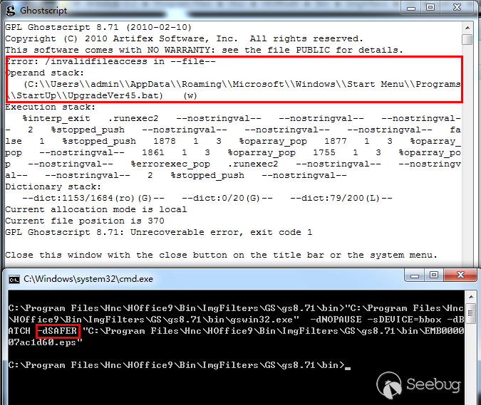 360威脅情報中心安全研究員通過手動調用gswin32.exe(GhostScript提供的一個解析EPS腳本的外殼程序)來解析惡意EPS文件,并加上了-dSAFER參數,此時gswin32.exe提示“invalidfileaccess”,即未能將文件寫入到磁盤(寫入啟動項失敗,這也反面證明了漏洞的成因)。如下圖: