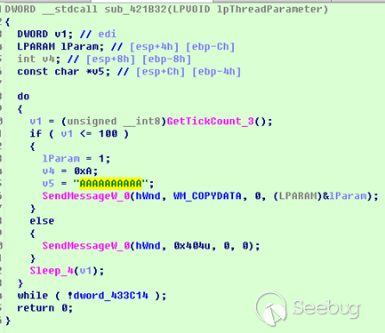 取當前TickCount 進行比較,低位小于100則發送 WM_COPYDATA指令 主窗口循環在接收這一指令后,會休眠一定時間