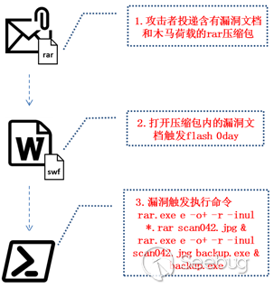 攻擊者通過投遞rar壓縮包發起攻擊,打開壓縮包內的誘餌文檔就會中招。完整攻擊流程如下: