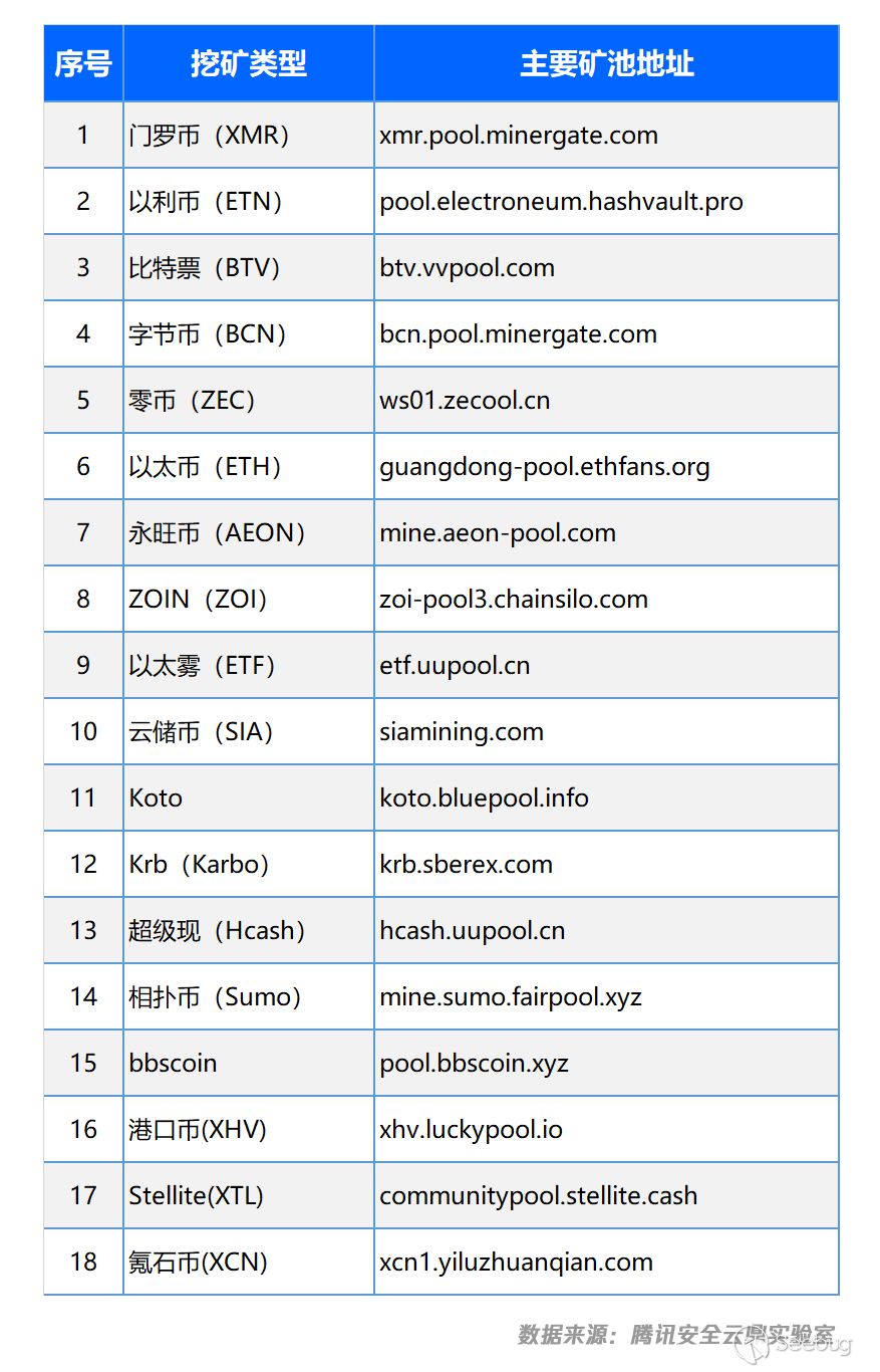 以下為云上黑客入侵后挖礦的主要幣種和礦池列表: