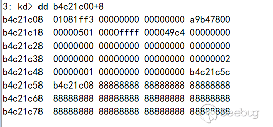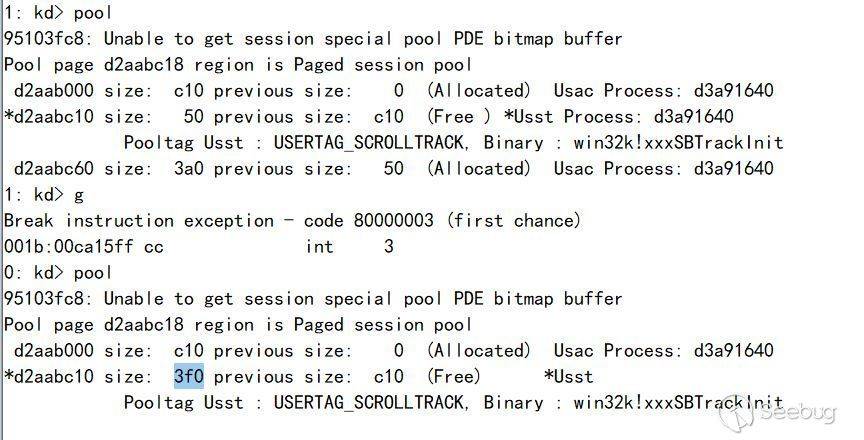 現在已經滿足了我們理想圖中的倒數第二種情形。我們已經把一個0x50大小的內存轉化成了0x3f0大小的內存,這足以容納我們的Palette對象。回翻一下漏洞分析中,在之后回到內核態后,系統會繼續釋放d2aabc10這塊內存。所以我們在這里放的任何對象,都會被釋放。那么放什么合適呢?