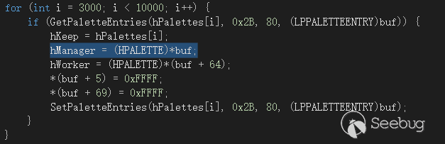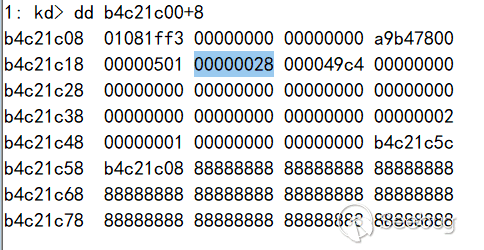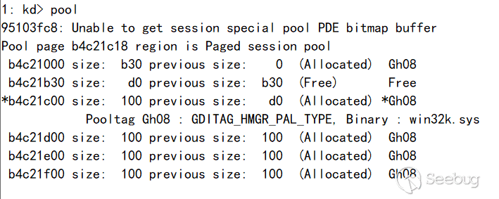 這里說一點故事,本人一開始想在這里直接放一個Palette更改掉大小來完成利用,在各種嘗試后發現,這思路根本不對,這個坑的結果是:Palette如果被釋放了,那么會在它源GDI header的handle處(第一個DWORD)寫上內存管理結構。這造成的結果是,雖然內核的句柄表還有這個句柄項,內存也指向正確,但是你卻不能操作它,因為會在驗證句柄階段直接發現異常殺死線程。在苦苦分析后依然不得其法,所以只好尋找另一條路徑。