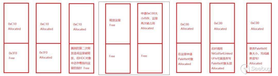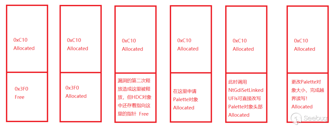 由于空間根本不夠我們去部署一個GDI對象,所以需要想辦法擴展這個空間。在內存管理中,對于這種動態劃分的內存塊,無法預知大小,就是用戶態的堆、內核態的池。所以給了我們一個可利用的機會,就是雖然申請時是0x50大小,但釋放時只是按照內存管理機制來釋放,沒有判斷內存大小釋放已經改變的方法。所以我們可以在第二次釋放前,可以讓這塊內存為任意大小,也就是在二次釋放前,我們重新申請到這塊內存,并且申請時是一個足以容納Palette的大小(由于bitmap在win 10 RS2中已經更改修復,所以我們選擇Palette對象)。從而實現擴展目標內存大小的目的,我們想要達到如下效果:
