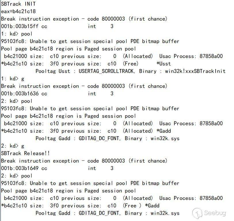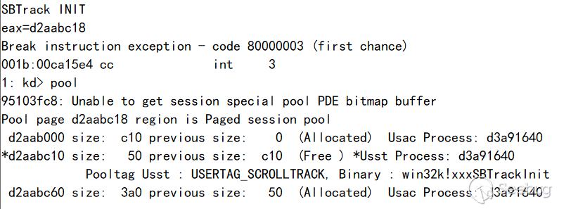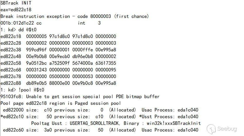 ba e 1 win32kfull!xxxSBTrackInit+0x59 ".echo SBTrack INIT;r eax;r @$t0=@eax;g";