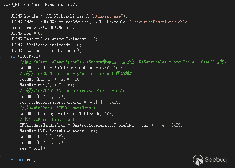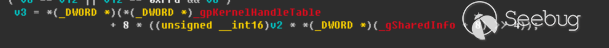 其中gSharedInfo+8在win10上固定為0x10,則計算方法為:*gpKernelHandleTable + 8 * (handle & 0xffff)。那么只剩最后一個問題:gpKernelHandleTable的值如何得到?由于這是win32kbase.sys的全局變量,獲取win32kbase.sys+偏移的方式?一是有通用性的問題,二是獲取win32kbase.sys加載地址也麻煩,所以換一個方法。我們回到HMValidateHandle函數中,這個轉換過程就直接有gpKernelHandleTable。所以我們采用搜索的方式,那么它的上層函數NtUserDestroyAcceleratorTable地址如何得到呢?