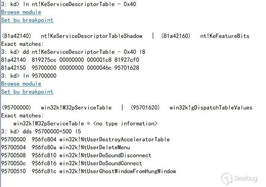 由于這是直接的系統調用,所以肯定在win32k!W32pServiceTable中,查找資料發現這個調用表可以在KeServiceDescriptorTableShadow+固定偏移中找到,而KeServiceDescriptorTableShadow雖然沒有導出,但它固定在KeServiceDescriptorTable-0x40處。所以這就找到了一條可通行的路徑: