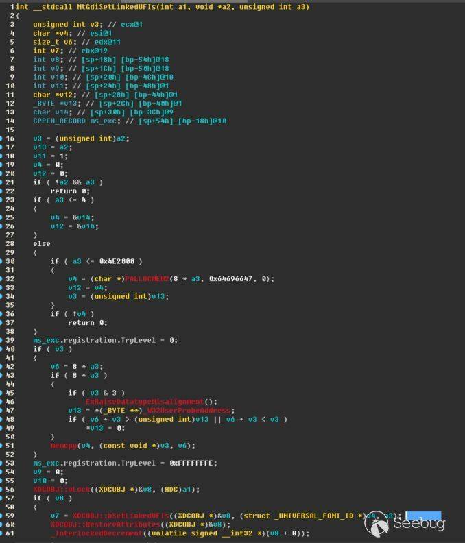 可以看到第11行的V5來自于該對象0xe0處的一個成員。而如果為零的話,則直接到了36行(其中a3來自于上層調用又來自于API調用的參數)調用PALLOCMEM2申請了一塊用戶指定大小乘以8大小的內存,只要簡單看PALLOCMEM2函數的第二個參數是個tag就知道這個肯定也是在頁會話池中。之后就把申請到的內存放在了0xe0處,并且在跳到19行后在自身成員中保存了a3。其中重要的是17行的memcpy,它的a2來自于上層的用戶指定----這意味著我們可以直接控制往E0處所指的內存寫任意字節,完全沒有改變!而如果是第二次調用此API,則根據API的參數來判斷是要新申請更大內存還是直接更改已保存的內存----這意味著我們可以第二次直接平坦的寫目標內存!這完全滿足我們的需求!再回頭仔細看看NtGdiSetLinkedUFIs,第一個參數是一個HDC對象,第二個參數是要寫的內容,第三個參數就是要寫的字節數除以8。