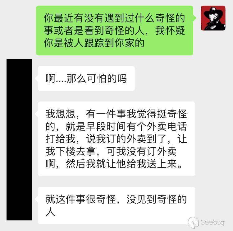 我給外賣小哥打了個電話,問他還記不記得2月8號往XX樓送了一份外賣,他問我有啥事,我說有個女生被變態跟蹤了,想問問你那天的一些情況,還好小菲長得挺漂亮的,小哥對她還是有印象,我問小哥當時有沒有看到奇怪的人,有沒有人跟你上樓。